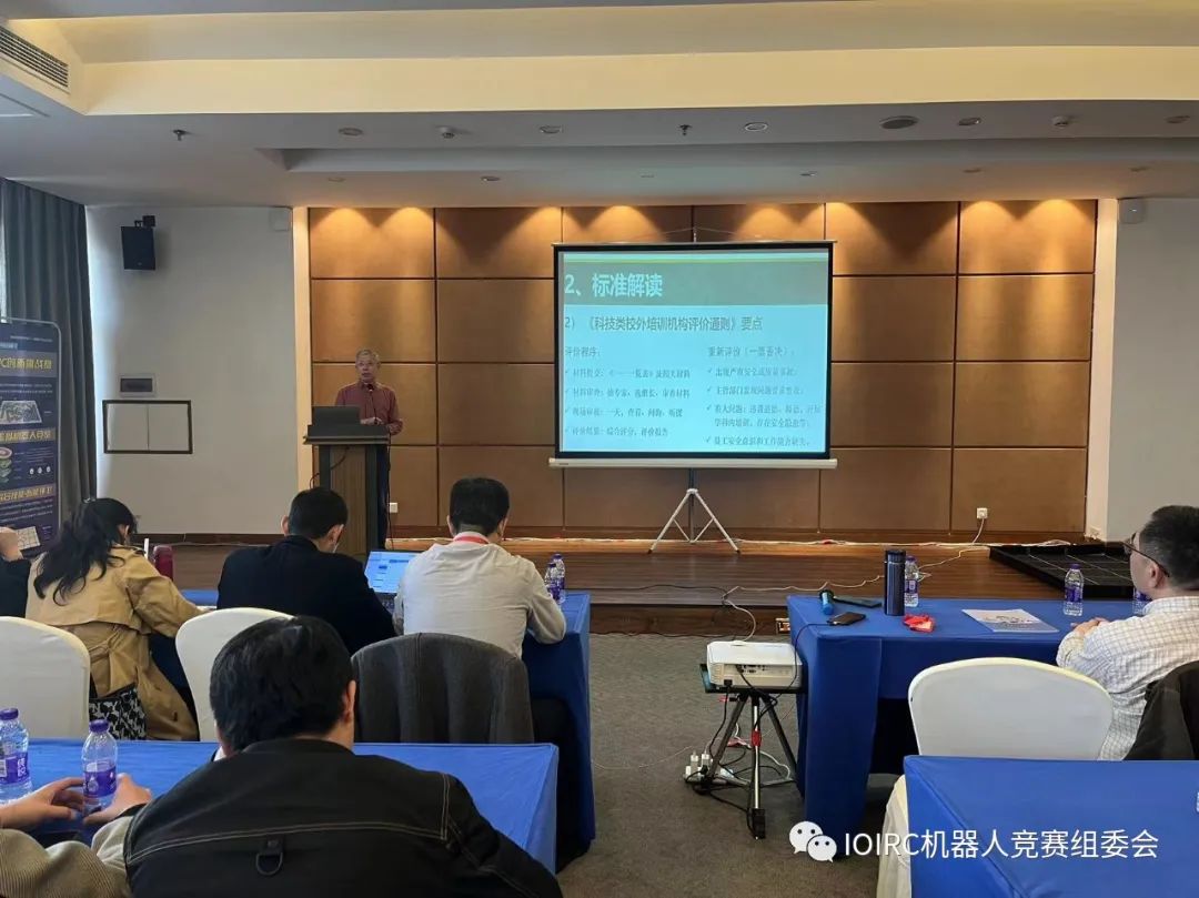 随后湖南省地方标准《青少年机器人培训》主要起草人杨益强就行业相关的最新政策进行了介绍,对新制定的《科技类培训机构评价通则》和《青少年机器人培训》三个标准的修订内容进行了讲解,并向大家公布了今年将要开展的专项活动计划。